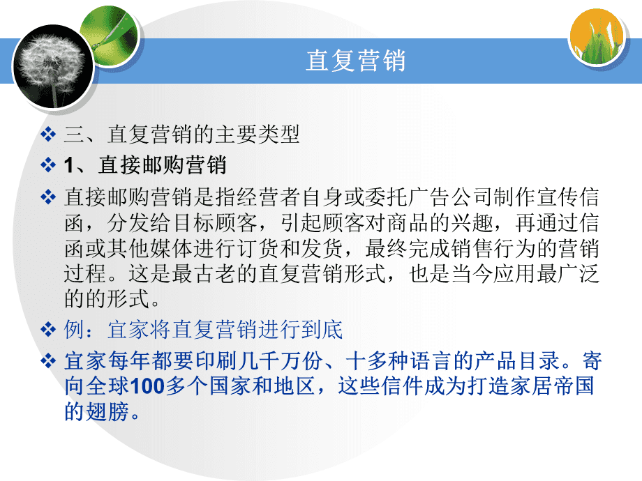 6、直复营销简称直销直销最初被当作一种无店铺销售的零售方式而产生,于20世纪90年代初登陆中国,变身为中国式有店铺直销,呈现出史无前例的发展速度和影响力作为一种新型的营销方式,直销存在空间时间商品和对象四方面的局限性,不可能。