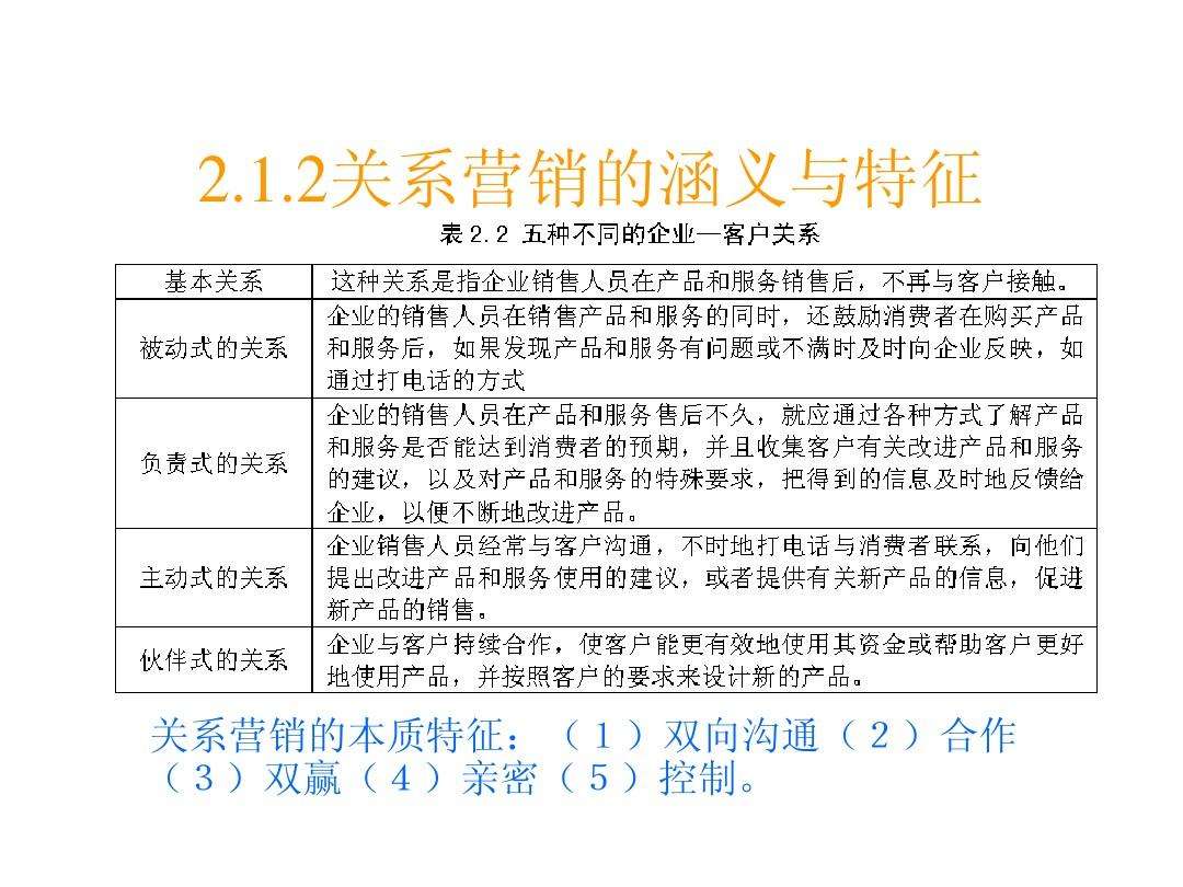 5、越来越多的企业意识到,寻求与客户建立和维系一种长期的战略伙伴关系是使交易双方企业获得quot双赢quot的最大保障因此在此基础上,关系营销应运而生关系营销是美国营销学者巴巴拉·杰克逊于1985年首先提出的,菲利普·科特勒在其。