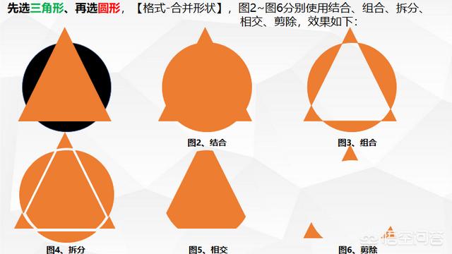 注意:两张图做合并形状时,先选哪张后选哪张,形状和颜色都完全不一样哦(1)先选圆形、再选三角形,【格式-合并形状】,图2~图6分别使用结合、组合、拆分、相交、剪除,效果如下: