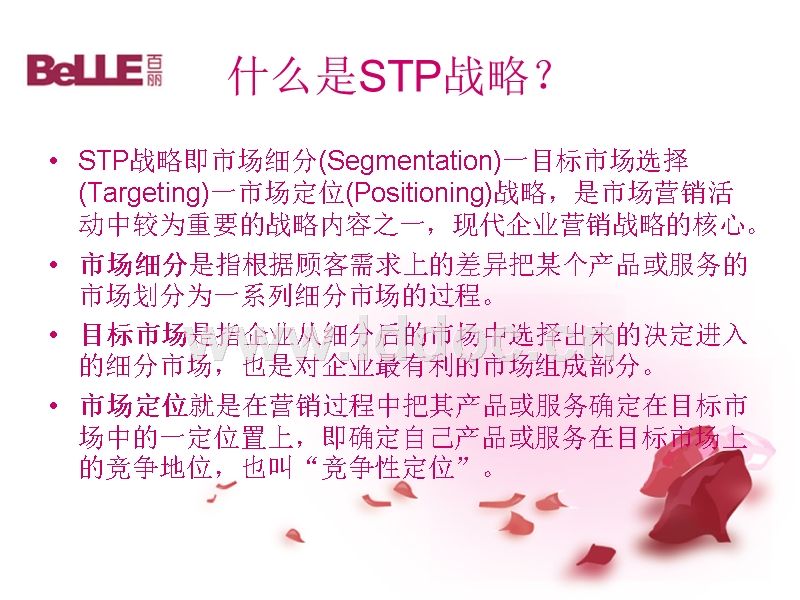 在营销理论中,市场细分Segmentation 目标市场Targeting 定位Positioning 都是构成公司营销战略的要素,被称为营销战略的STPSTP理论的根本要义在于选择确定目标消费者或客户,或称市场定位理论根据STP理论。
