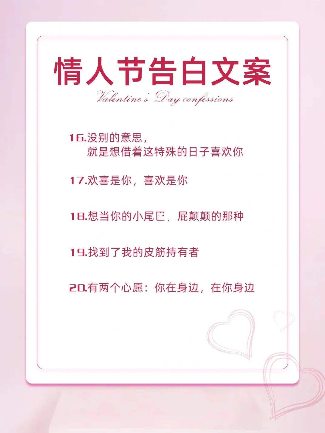 1你是我绕过山河错落,才觅到的人间烟火2春来夏往,秋收冬藏,我们来日方长3始于懵懂,终于白首,拥之则安,伴之则暖4世界的温柔,是晚来的善意,和刚好遇见你5青梅竹马不是你,情窦初开不是你;14你是我结束一天的疲倦后,让我欣喜的那个人15因为疫情,情人节不能见面,希望我这个小朋友 ,能让你难忘又牵挂16感谢万有引力,将我拉向你17今天没有文案,只有一句ldquo我爱你rdquo。