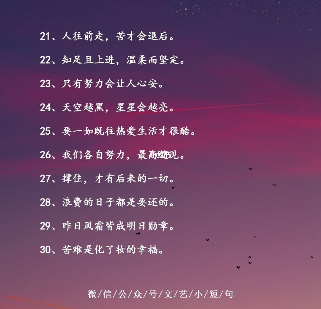 10 即使没有人为你鼓掌,也要优雅的谢幕,感谢自己的认真付出 通俗类 1 每一次的离别,都是为了下一次更好的相遇 2 套路的话别记太久,撩你的人别放心上 3 不随波逐流,也不随心所欲,初心待事,真心待人。