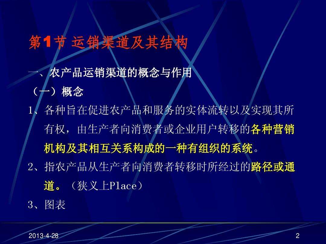 滞销的局面,损失是非常巨大的,产品在有传统农业到现代农业迈进的过程中,怎么突破销售困局,怎么让我们生产的农产品不愁销售,是所有研究农业问题人士关心的,下面要阐述的不是农业产业政策与农业现代化建设,而是怎么样拓展农产品的销售,谈;农产品销售渠道1批发市场 农产品批发市场以大宗农产品为主,如白菜大蒜茄子等,交易具有显着的季节性,所供应产品一般以当季果蔬为主批发市场的模式,又能细分为两种,一种是把自己种植养殖基地的农产品,直接;二农产品销售渠道 1随着5G时代的到来,大数据时代,处在流量市场的尖端,各式各样产品都可以放在网络平台上进行销售,当然,这其中也包含了农副产品把农副产品放在网络平台上进行销售,方便了人们的购买,同时也方便了;然后以合理的价格借助有效的宣传,通过高效率的流通渠道把农产品在人们需要的时间和地点销售给消费者二农产品营销的特点1开展农产品营销时,要根据农产品的不同特点采取不同的营销策略2农产品营销活动的风险性较高。