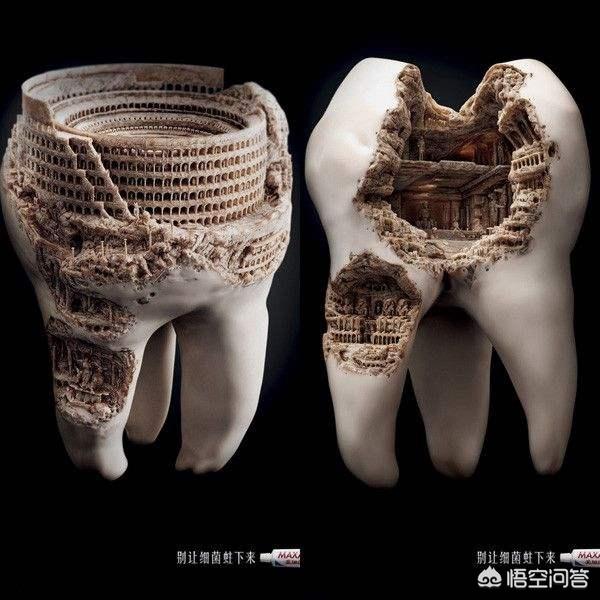 看看牙刷的这则广告。 其中显著体现了比例缩放的原则——首先,牙齿已经放大了很多,但重点仍然在被雕刻成精细建筑的牙齿上。使用大幅度的比例缩放不仅能够吸引观众看得更仔细,而且还强化了“大始于小”的概念。吸引消费者的注意力从而告诉大家“别让细菌蛀下来”,不可谓不巧妙;