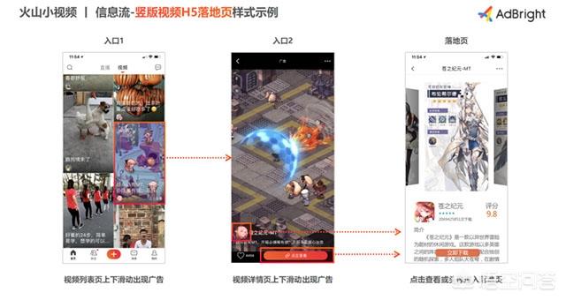 目前火山小视频首页视频信息流支持落地页广告和应用下载广告,主打原生广告,给用户沉浸式体验,展现形式均为竖版视频。
